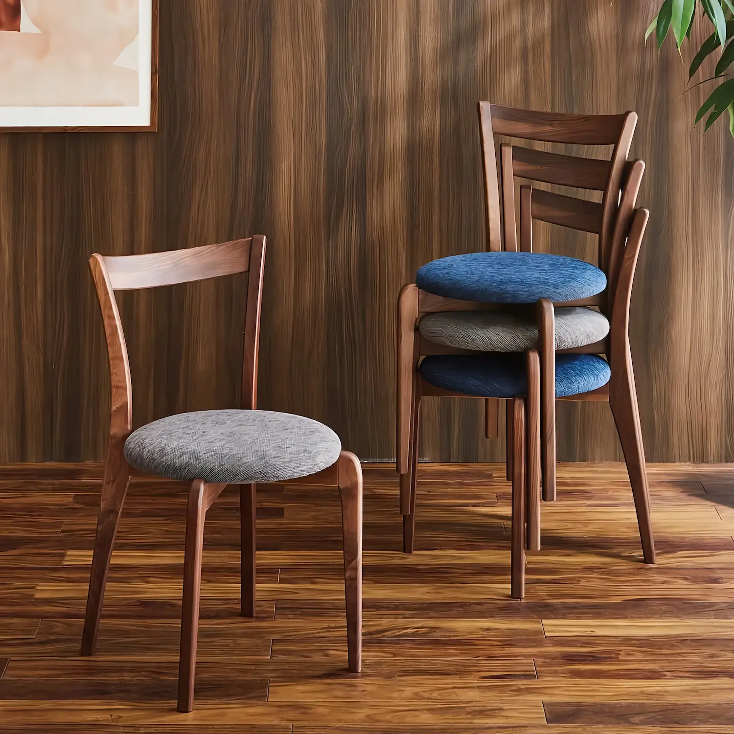 最大5脚まで重ねて収納可能。来客用のサブチェアとしても、お掃除・模様替えの際にも、手軽に扱える便利な仕様です。