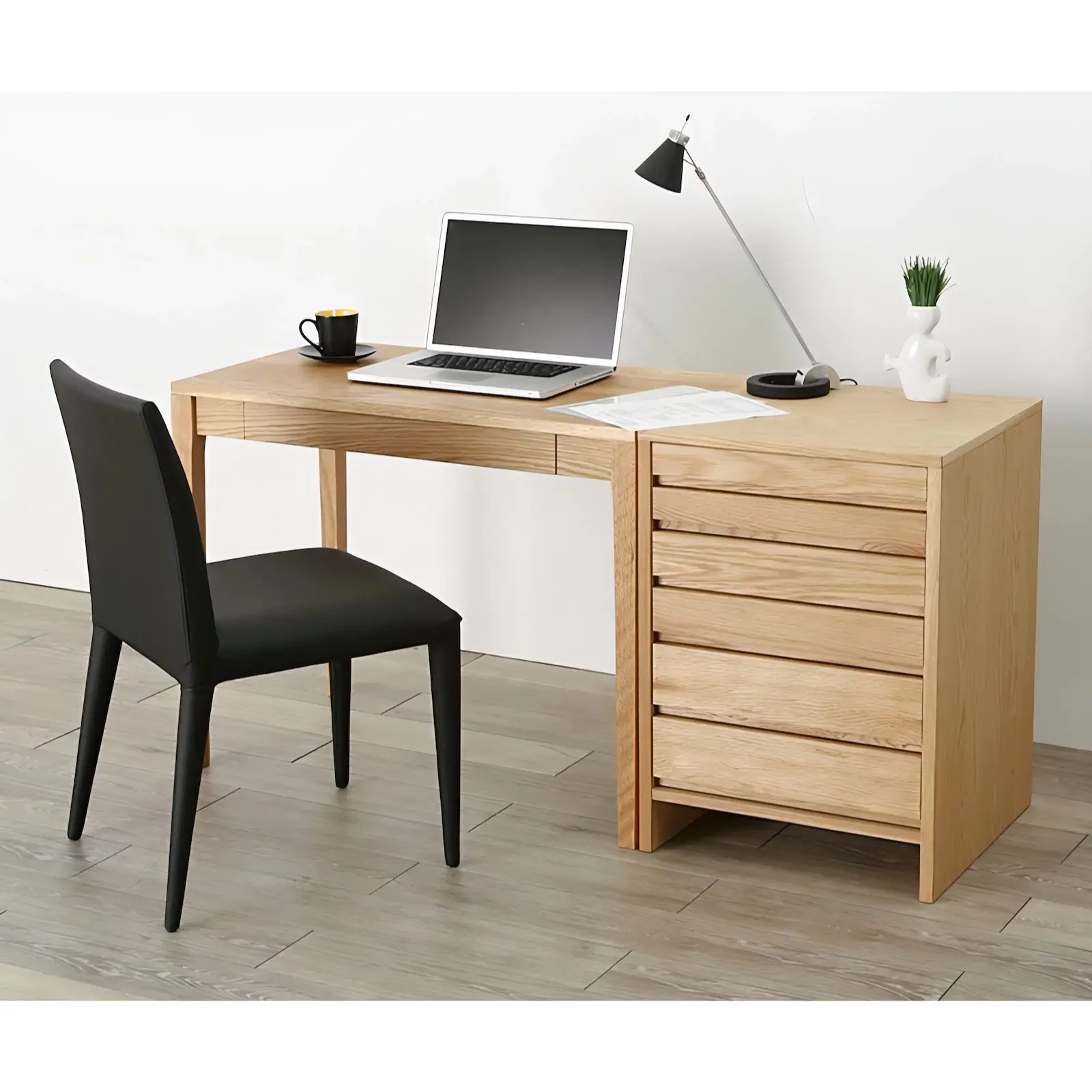 無垢材を贅沢に使ったミニマルなデスクと、実用性たっぷりの6段チェストのセット。リビングにも書斎にも馴染む端正なデザインで、使うほどに味わいが深まります。